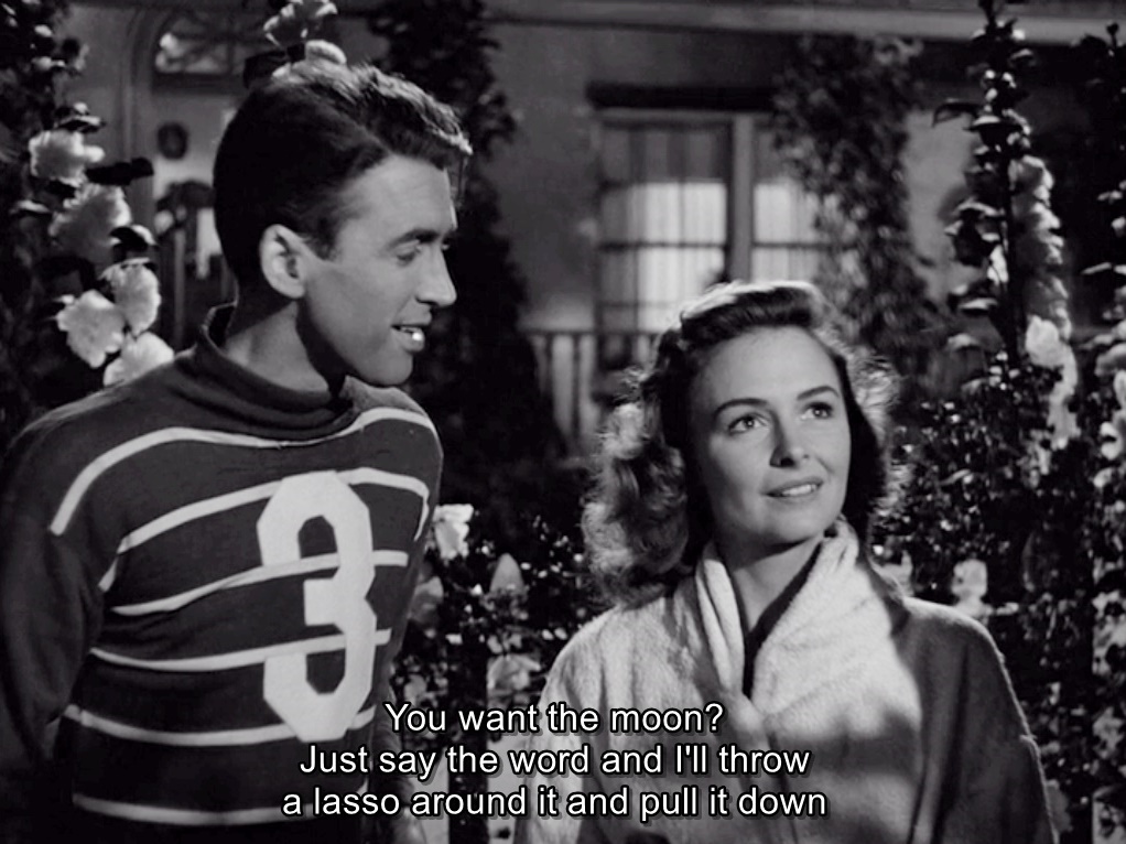 The other day, I saw the classic Christmas movie, It’s A Wonderful Life, for the first time. It’s one of those movies that’s so classic that referencing it has become a part of pop culture, such as the scene on the right when George Bailey says, “What is it you want, Mary? What do you want? You want the moon? Just say the word and I’ll throw a lasso around it and pull it down.” I’ve seen this in various pop culture references, but even better, George lassoing became a running inside joke between him and Mary throughout the rest of the movie.