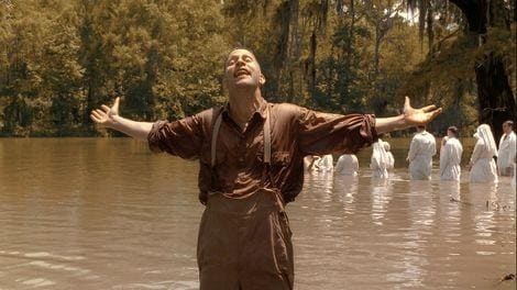 This is clearly a baptismal hymn, which O Brother portrays when Delmar and Pete get baptised. Delmar is the first to go. The Gospel clearly speaks to him in the words of this hymn. The singers invite all to come “down in the river to pray” to “wear the robe and crown” of Christ. This brings to mind Galatians 3:27, “For as many of you as were baptised into Christ have put on Christ” (see also Revelation 6:11; 19:8; 22:14). Delmar tells the exciting news to Pete and Everett that the preacher told him all his sins were washed (or “warshed”) away. Hearing this Good News, Pete runs down in front of all the other people to get baptised. Their sins get washed away—yes, even the crimes that landed them in prison, whatever those were.