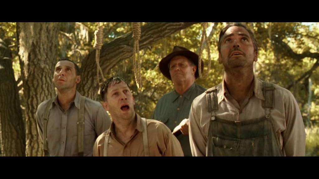 If you’ve seen the movie, it probably didn’t take you long to realise that Everett is Lazarus in the song and Sheriff Cooley, who chases Everett, Pete, and Delmar throughout the movie, is the sheriff in the song. I believe this song foreshadows Everett’s capture at the end of the movie (a different song is sung at this point, which we’ll get to later). It seems that Everett is about to die, but miraculously, the Mississippi River floods and he and his companions escape while the sheriff and his deputies do not. In the song, it appears as if poor Lazarus is about to die, whether that be from the gunshot wound or to be hanged by the sheriff once he’s brought to town. But the song never tells us the fate of poor Lazarus. Perhaps, then, as Everett’s survival tells us, we are to assume that Lazarus somehow survives, at least according to the Coen Brothers’ likely interpretation.