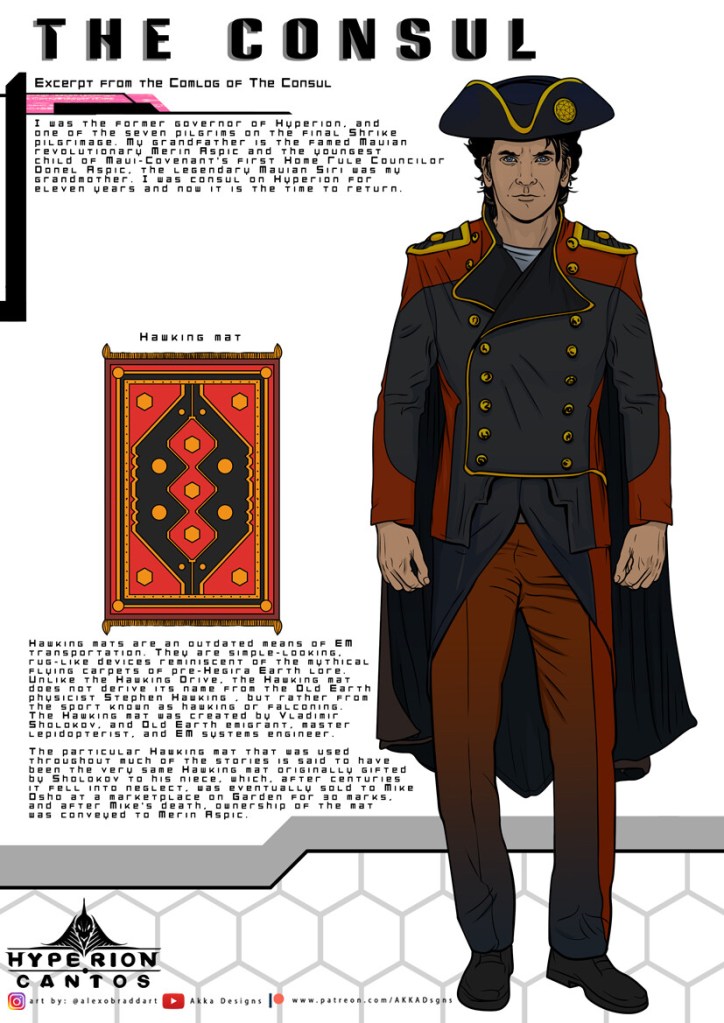 The Consul—the final narrator of the seven pilgrims in Hyperion—is a man defined by dual allegiances and long memory. As a descendant of the Hegemony’s colonizers and the leader of a long-planned rebellion against that very system, he stands at the crossroads of history, heritage, and judgement. His pilgrimage is not one of curiosity or desperation, but penance.