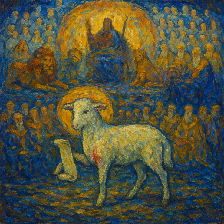 But then, a voice breaks the sorrow: “ ‘Do not weep. Behold, the Lion of the tribe of Judah… has prevailed to open the scroll and to loose its seven seals’” [v. 5]. A Lion? Yes, that is what we expect: power, authority, and glory. The devourer of enemies. The conqueror of Death. And yet, when John turns, what he sees is not a Lion at all. He sees a Lamb. Not just any lamb, but one “as though it had been slain” [v. 6]. Torn open, bloodied, yet standing. Here is the great reversal: Victory has come not through the violence of man but through the self-giving of God. The throne of Heaven is claimed by a crucified King.