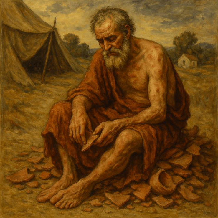 Job’s affliction now touches his own body: “So Satan went out from the presence of the LORD and struck Job with painful boils from the sole of his foot to the crown of his head” (v. 7). This is no superficial disease. Later descriptions reveal skin blackened, bones burning, breath repulsive, and flesh clinging to bone (cf. 30:17, 30; 19:17, 20). The man once called “greatest of all the people of the East” (1:3) now sits in ashes, scraping his dead skin with broken pottery.