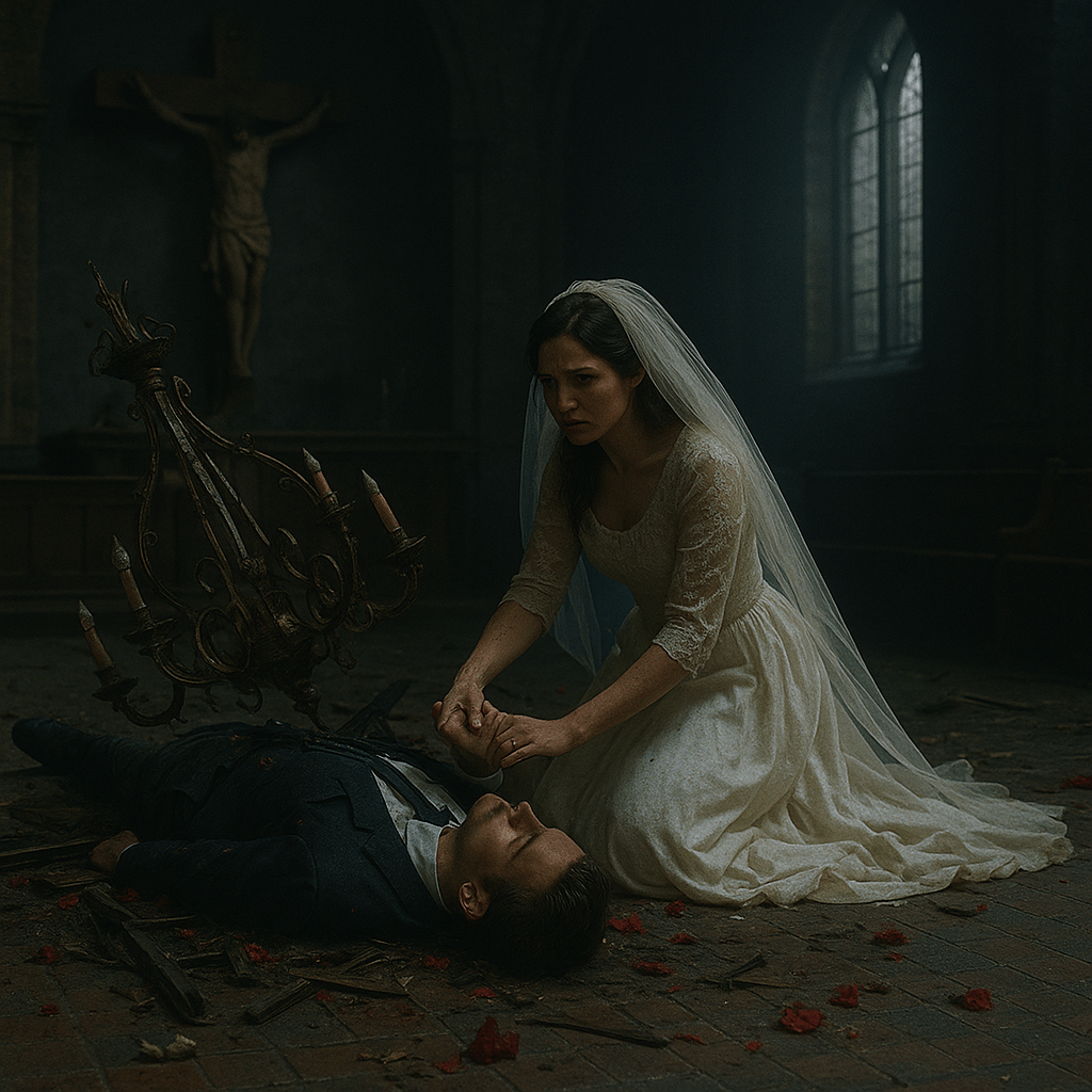 She dropped to her knees beside Elijah, her veil torn, her dress stained with crimson, her hands shaking as she cradled his body.
